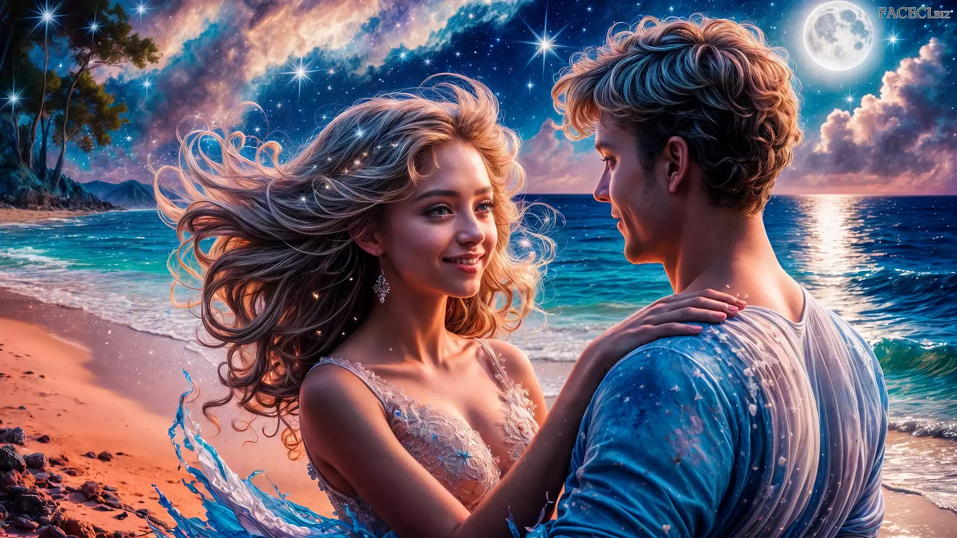 Księżyc, Kobieta, Mężczyzna, Morze, Grafika, Zakochani, Noc - faceci.biz