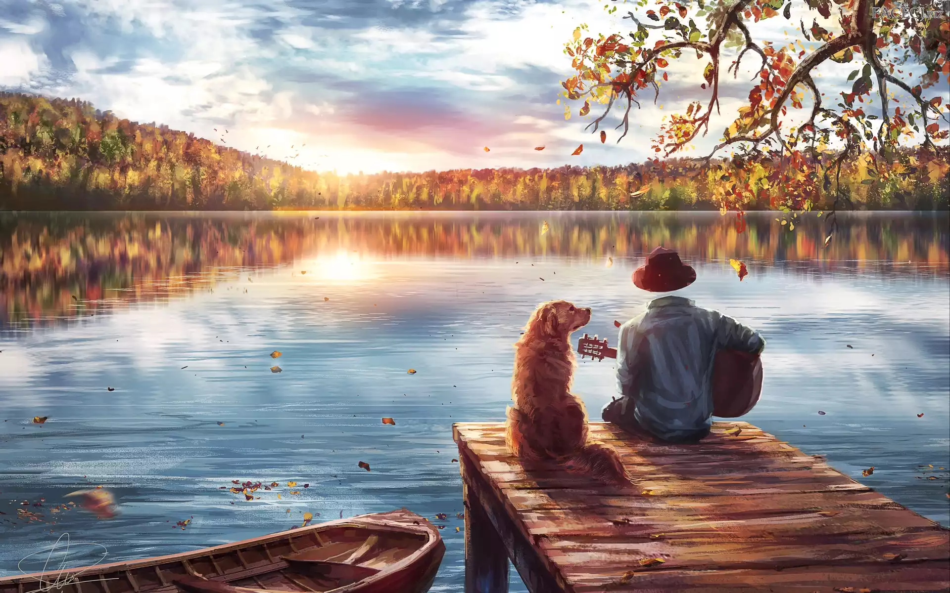 Grafika, Pies, Jesień, Łódź, Gitara, Pomost, Jezioro, Postać - faceci.biz