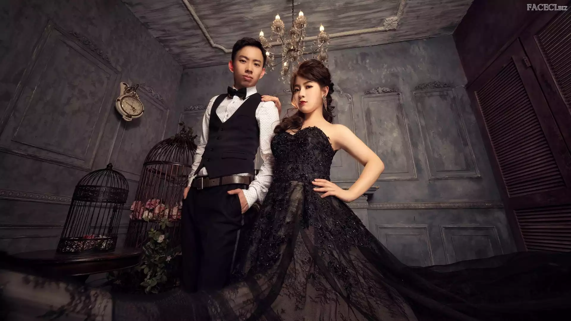 Suknia, Kobieta, Zegar, Klatki, Czarna, Mężczyzna - faceci.biz